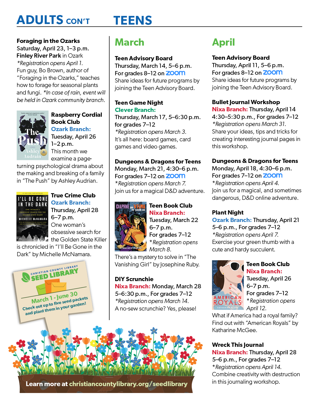 Below are various articles I wrote that are currently published on the Christian County Library’s website.I also created the graphic design assets for these articles. Family Road Trip with the Library - Published June 30, 2021 My Day with Outreach - Published April 7, 2021 My Day with MOBIUS/ILL - Published March 24, 2022 My Day With Collection Services - Published November 19, 2021 Missouri Bicentennial - Published August 6, 2021 During my time at the Christian County Library, I also had the opportunity to create, format, and publish two editions of the library’s periodical events calendar called the Page Turner.Below are images of one of the editions I worked on.